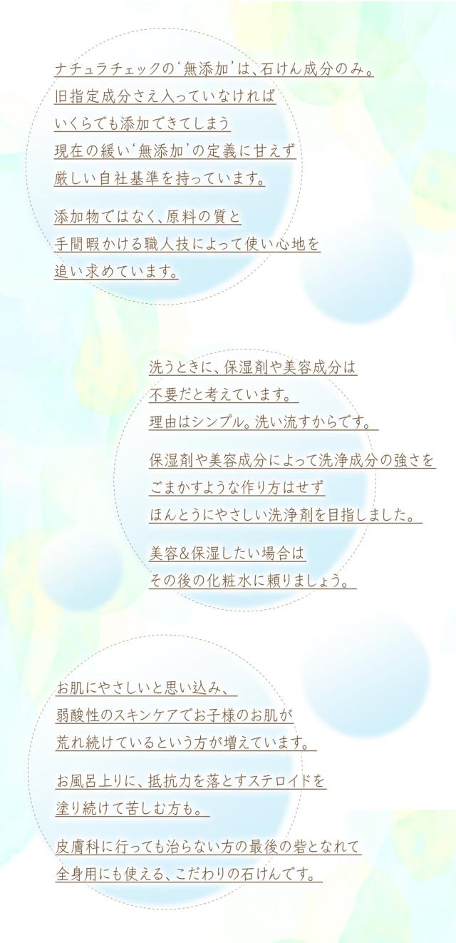 石鹸の特徴:低温釜焚製法 コールドプロセス 完全無添加 せっけん成分のみ