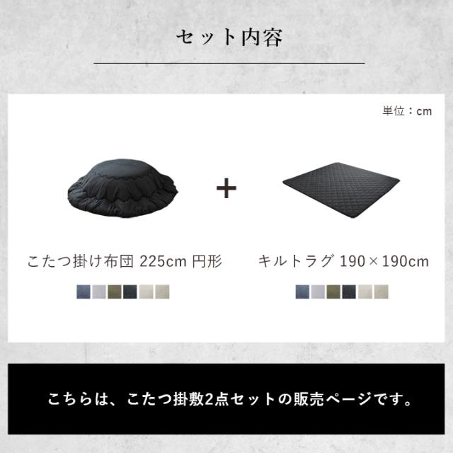 | 掛布団:約225cm円形 キルトラグ:約190×190cm(約110cm円形 のこたつ台対応) ※キルティング加工許容範囲 +5%−3% |