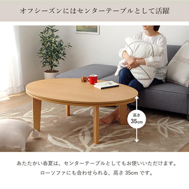 | こたつ掛布団:約185×225cm楕円形 (キルティング加工許容範囲 +5%−3%) こたつ台:75×105cm楕円形 |