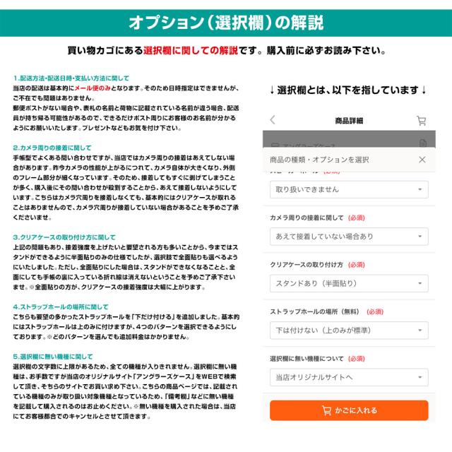 | 在庫について | 機種によっては、当店にクリアケースの在庫が無い場合があります。その場合は、取り寄せてから制作・発送しますので、通常より発送が遅れます(機種にもよりますが、およそ3-10日間)。 他店舗展開しているため、ご注文頂くタイミングによっては、在庫がある商品も、注文後に欠品になる可能性がございます。 |