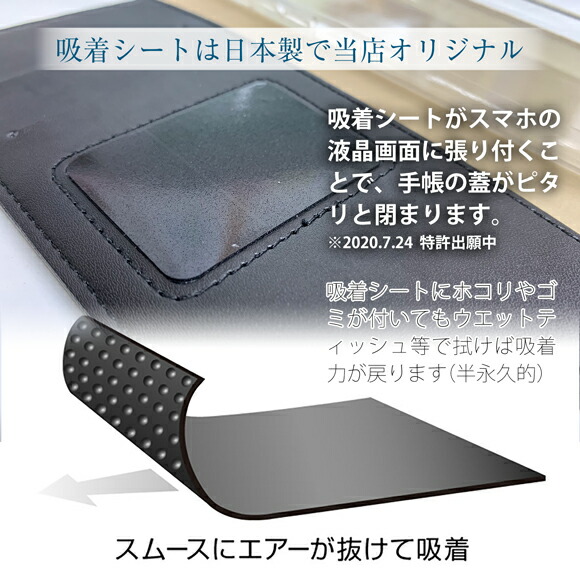 | 吸着シート | 当店独自の吸着シートは、指で触ってもベトベトしないシート。スマホ本体の液晶画面や保護フィルムに張り付き、しっかりと蓋が閉まります。もちろん液晶画面や保護フィルムを傷つけることもなく、跡も残りません。また、毛玉やホコリが付いても大丈夫。汚れが酷い時には、ウエットティッシュなどで吸着シートを拭けば、吸着力が戻り、半永久的に使用できる不思議なシートです。 |