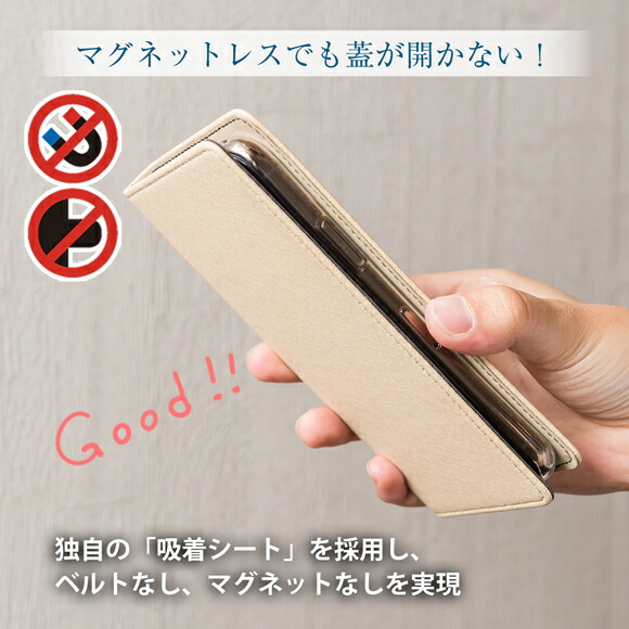 | 商品説明 | 当店独自のニューコンセプトケース!マグネットなし、ベルトなし、抗菌合皮で3つ安心。手帳の蓋にある「吸着シート」が液晶画面に張り付き、ピタッと閉まります。抗菌合皮は安心の日本製で、靴やソファーで使われる抗菌合皮を採用しています。吸着シートで全機種スタンド可能。機種に合わせた専用ケース、専用カメラ穴を空けてお届けします。高級感あふれる抗菌合皮「ベルサ豚」を採用!色はブラック(黒)、ブラウン(茶色)、ベージュ(肌色)の3色からお選び頂けます。 |