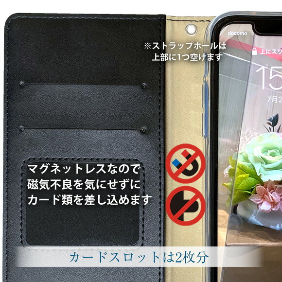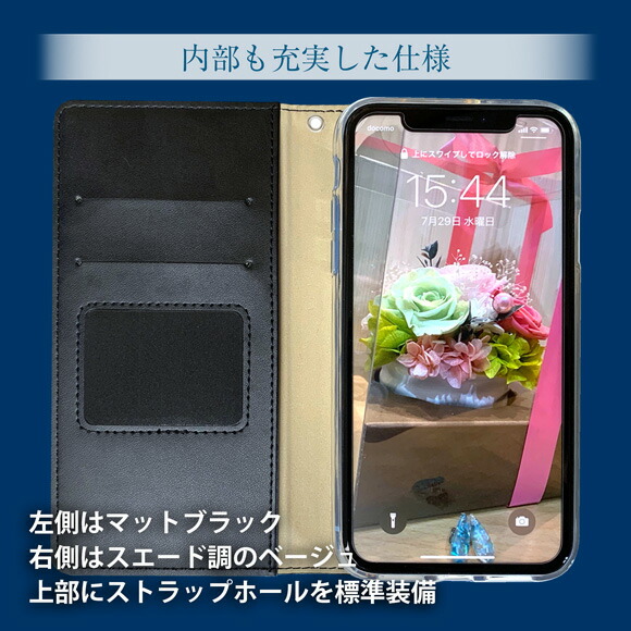 | 素材 | 高級人工革(外側)にUV印刷を施し、内側ではハードケース、もしくはTPUケース(機種によって異なります)で、スマートフォンをしっかりと保護します。 |