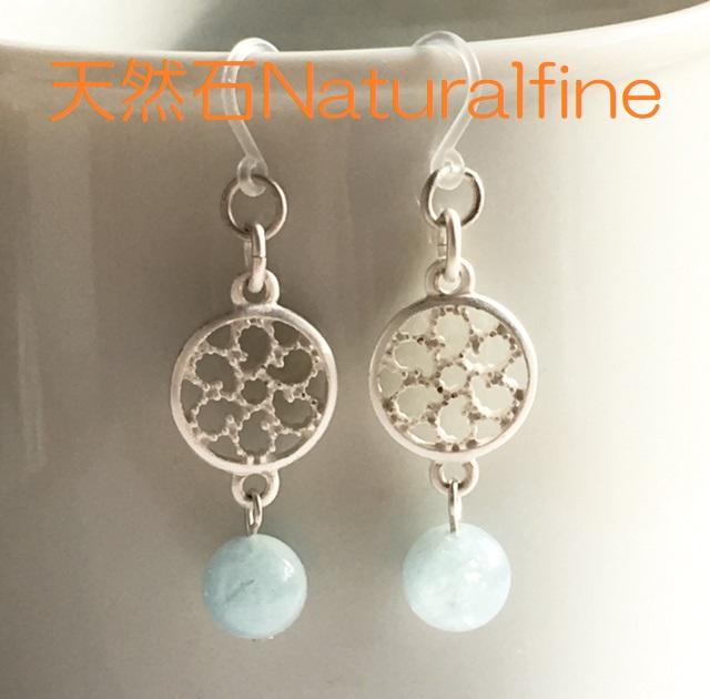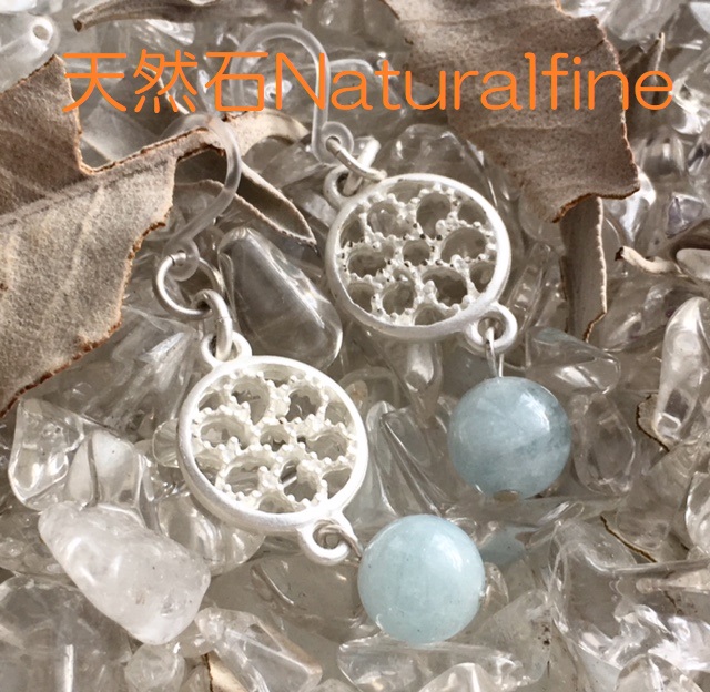 こちらは、天然石のアクアマリンに透かし模様のマットシルバーのデザインメタルを合わせたピアス(イヤリング)です