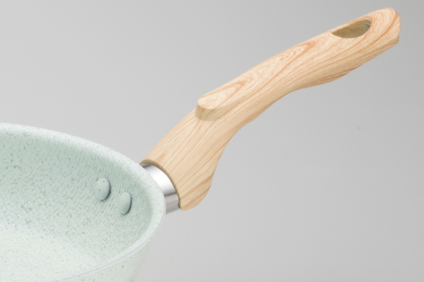 ヒスイパウダーによる淡いグリーン色と優しい色合いの木目のハンドルが、キッチンに柔らかな印象を与えます。ハンドルはフェノール樹脂製で滑りにくいです。
