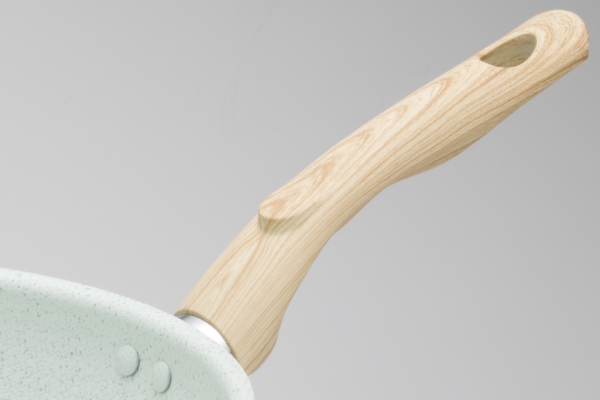 ヒスイパウダーによる淡いグリーン色と優しい色合いの木目のハンドルが、キッチンに柔らかな印象を与えます。ハンドルはフェノール樹脂製で滑りにくいです。