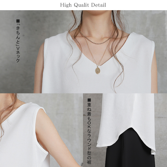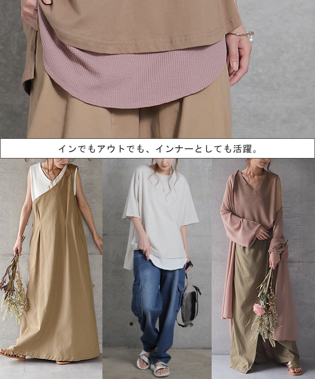 メール便送料無料 タンクトップ トップス レディース タンク ノースリーブ ワッフル生地 Vネック レイヤード 重ね着 袖なし 半袖 シンプル 無地 きれいめ ロング丈 ロングタンクトップ ラウンド カットソー キャミ 黒 白 冬 秋 秋新作