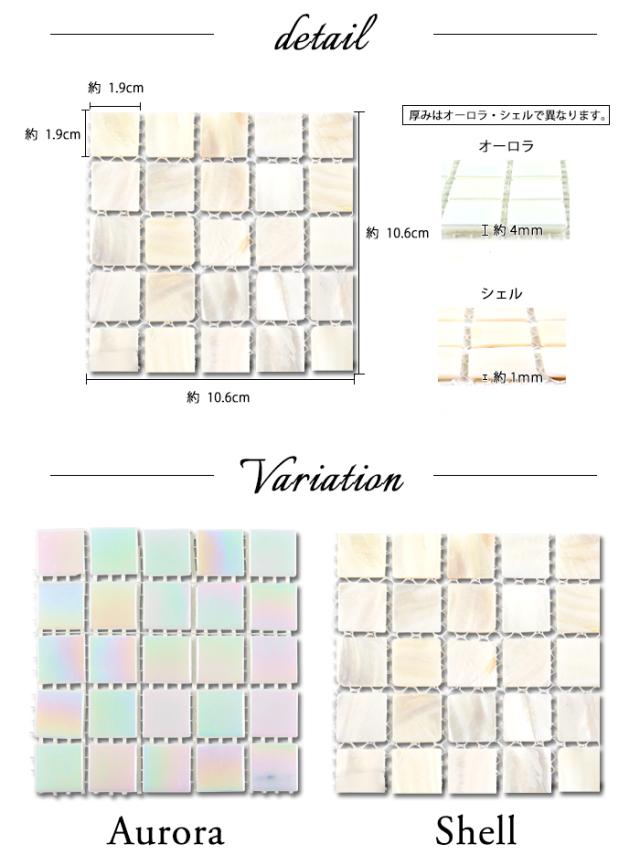 | サイズ/種類 | 【1】オーロラ ※粘着あり 1タイル約1.9cm×1.9cm 全体約10.6cm×10.6cm 厚み4mm 【2】シェル ※粘着無し 1タイル約1.9cm×1.9cm 全体約10.6cm×10.6cm 厚み1mm |
