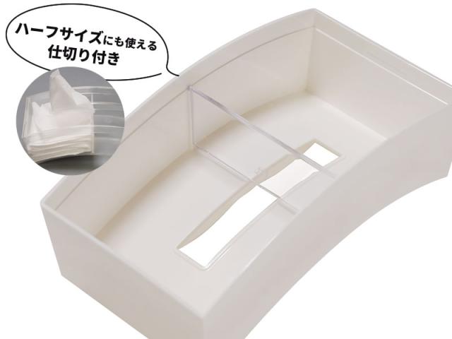 ハーフカットティッシュにもハーフカットサイズのティッシュペーパーが収納できる仕切り板付き。