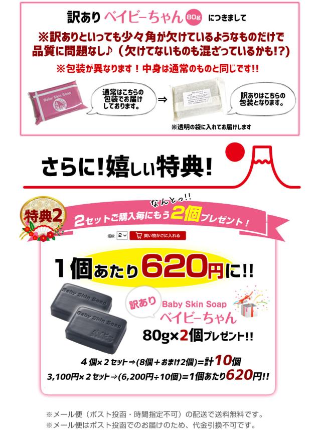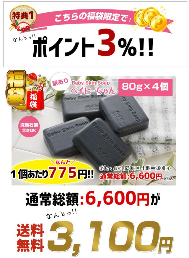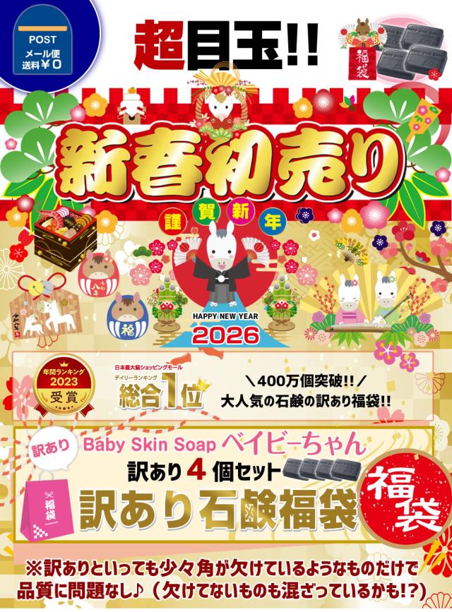 \2026年初売福袋/【訳あり】訳あり石鹸4個福袋♪ 総合1位獲得!400万個突破「訳ありベイビーちゃん4個」【メール便】送料無料 ※ 福袋特典【ポイント3%】&【2セットでもう2個⇒1個あたり\620円/に!】 ★ベイビースキンソープ 毛穴 黒ずみ 角栓除去 ニキビ予防