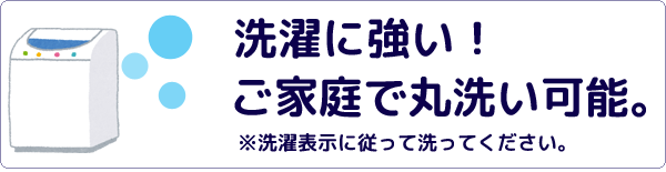 洗濯にも強く,水に濡れると強度が増します。家庭の洗濯機で丸洗いできるウォッシャブルタイプ。乾きも早いので洗濯回数の多い夏には重宝します。