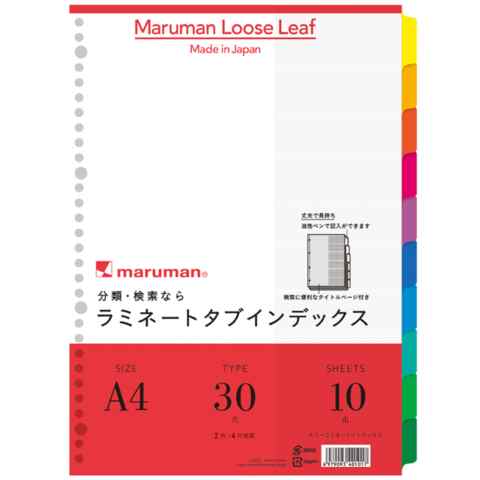 ストア内の商品は全品送料無料です。カラフルで見やすく、必要な書類が見つけやすい、書類整理必須のラミネートタブインデックス・見出し部分はラミネート加工、丈夫で長持ちします。・見出し部分には油性ペンで記入できます。・カラーで見やすく、必要な書類が見つけやすい。【規格】A4【穴数】30穴(4穴兼用)【本体寸法】縦297×横220mm【重量】120g【本文】10枚■メーカー: マルマン