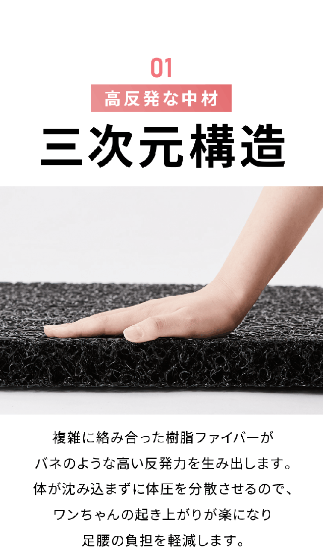 中材に3次元立体構造の樹脂ファイバー素材を使用したペット用マットレス