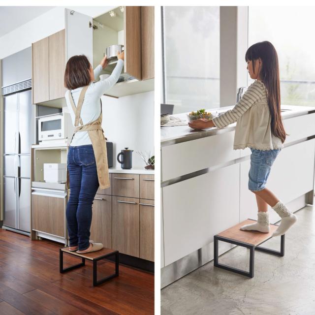 高くて届かなかったところにしっかり届く、スタイリッシュな踏み台。モノトーンのスチール素材と、あたたかい天然木の掛け合わせたデザインが北欧風でモダンな雰囲気。出しっぱなしでも生活感を感じず、インテリアにも馴染みます。