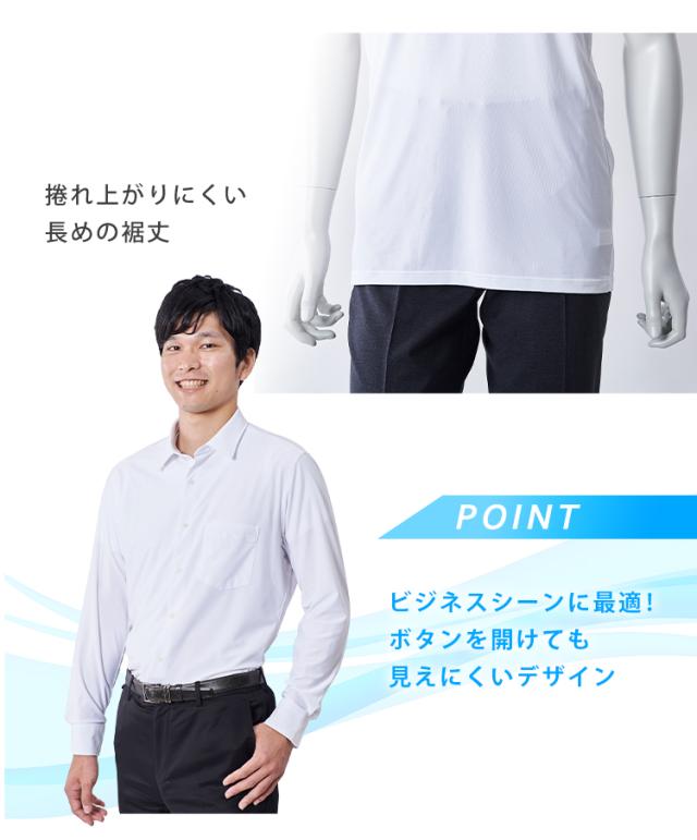 捲れ上がりにくい長めの裾丈で、ネック部分が深めのデザインなので、シャツのボタンを開けても見えにくく、ビジネスシーンにも最適です。