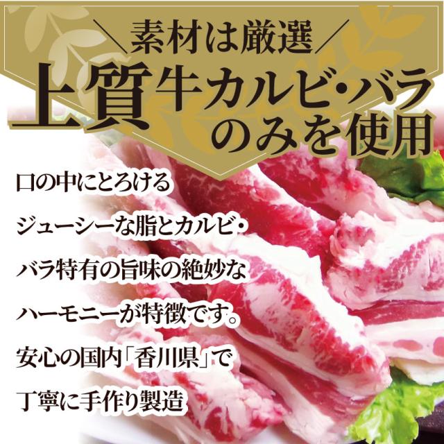 【原材料名】牛バラ、醤油、砂糖、リンゴ果汁、にんにく、本みりん、レモン果汁、植物油、ごま、玉ねぎエキス、生姜、ネギエキス、酵母エキス、コショー、唐辛子、調味料(アミノ酸等)、増粘剤(キサンタン)、みそ、アミノ酸液、ごま脂、醸造酢、香辛料、酒精(原材料の一部に小麦、大豆、りんご、ごま、豚を含む)【製造者】エイヨー食品加工センター高松市春日町1598
