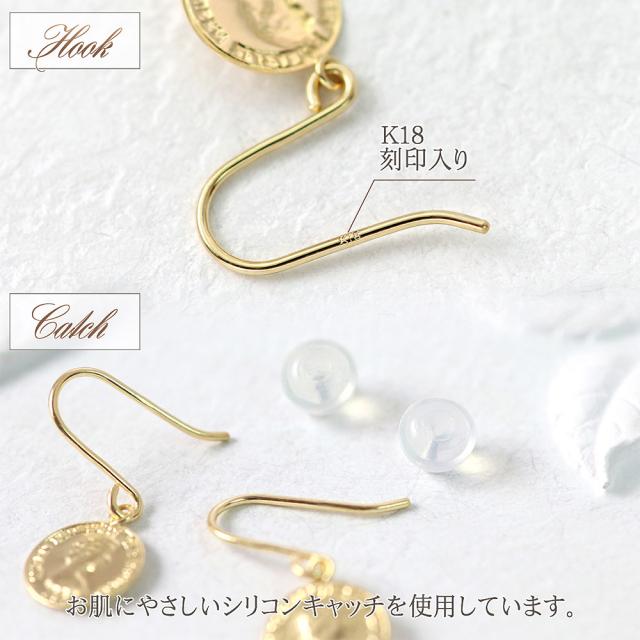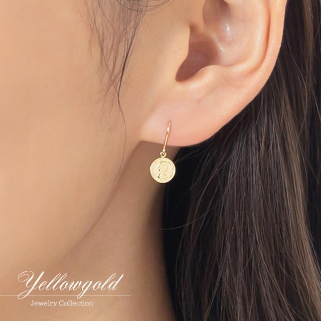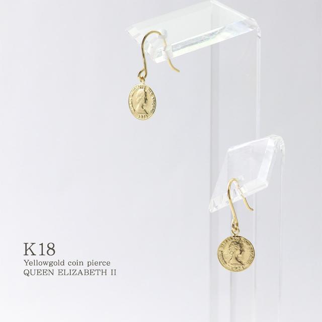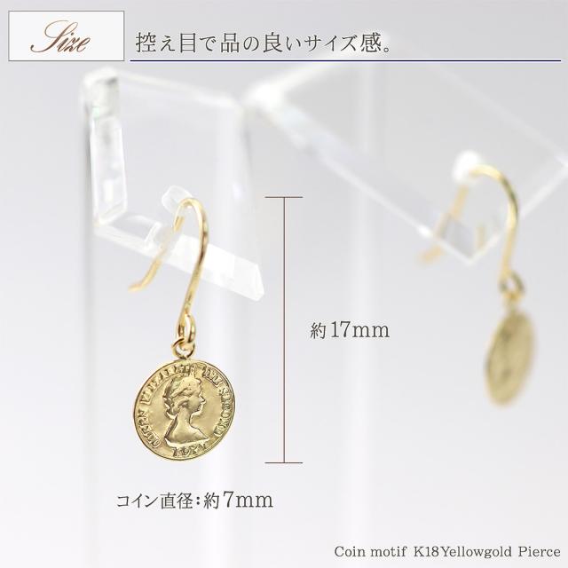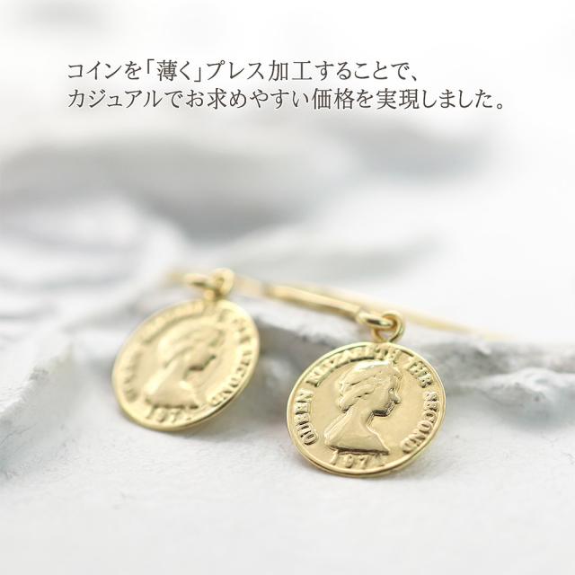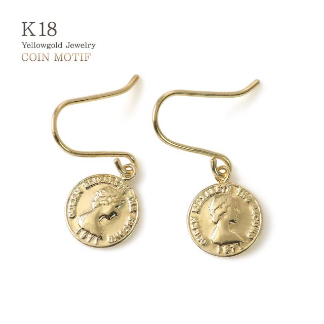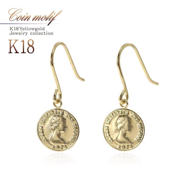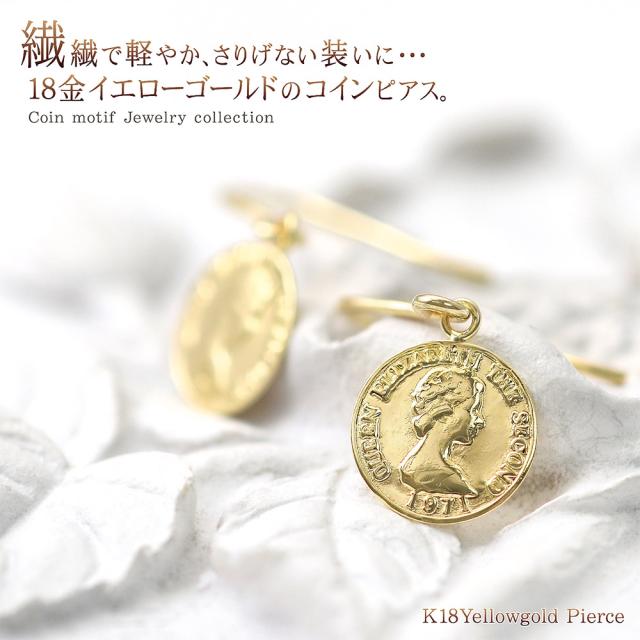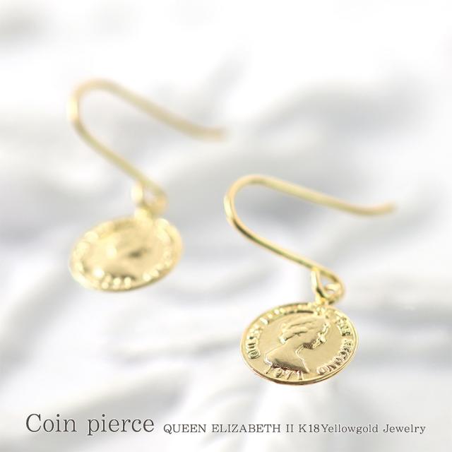 ピアス コイン レディース ゆれる フックピアス 18金 イエローゴールド K18 18K シンプル 小ぶり 小さめ スリム 薄型 誕生日 プレゼント かわいい 小さい 硬貨 エリザベス女王 軽い 女性 妻 嫁 娘 母の日 ギフト 2026 ギフト 記念日 誕生日 可愛い おしゃれ フック 揺れる