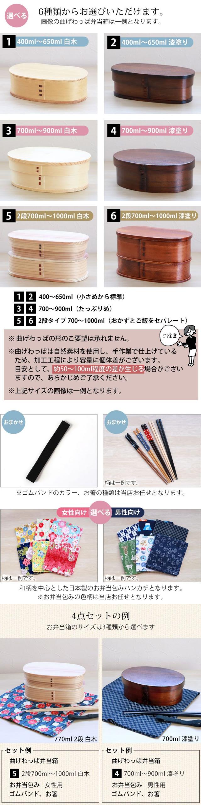 カラーは白木・漆塗りの2種類、お弁当箱のサイズは3種類から選べます。