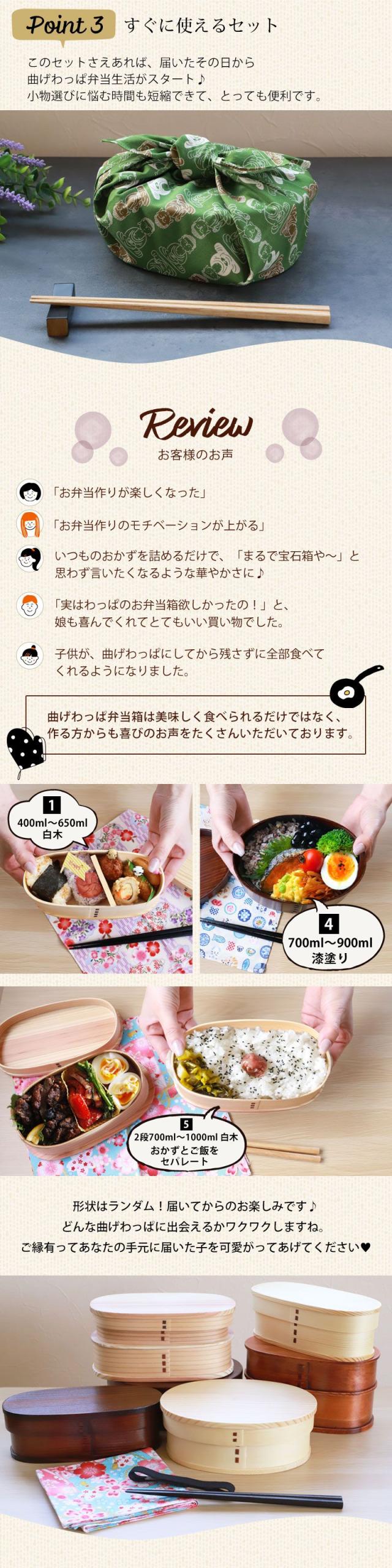 - 曲げわっぱは、欲しい形ではなかったけど満足しています。お弁当を包むハンカチは男子を選び、錦鯉の渋いのが届きました(笑) 箸は、木製の物が届くと思っていたらプラスチックの物が届いて曲げわっぱと合わせるとなんか違和感を感じて残念でした。