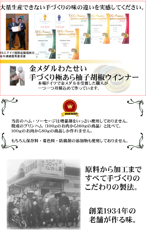 | 原材料名 | 豚肉 ゆず胡椒 柚子皮 食塩(岩塩)香辛料 リン酸塩Na 乳化剤 PH調整剤 乳糖 調味料(アミノ酸等)発色剤(亜硝酸塩Na) 酸化防止剤(ビタミンC) |
