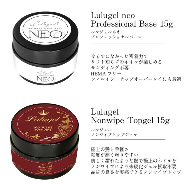 | 商品名 | 【LULUGEL NEO ルルジェル ネオ】 ジェルネイル プロフェッショナル ベースジェル 15g ルルジェル ノンワイプ トップ 15g |
