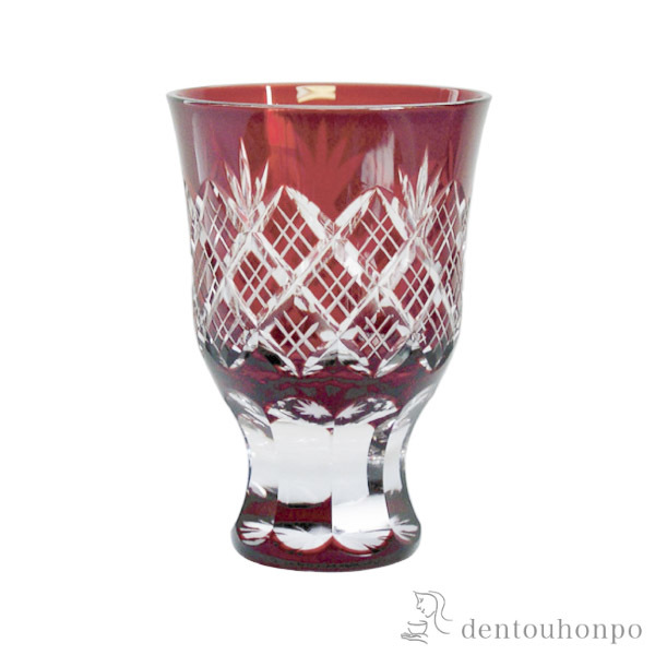 切子とは、砥石等の研磨材を用いて硝子器に彫り込まれたカット模様のことです。この技法は、江戸時代の後期より現代に伝えられてきた伝統工芸のひとつです。この硝子器は、江戸硝子吹き技法の色被せ硝子に、切子師の技が光り輝く手造りならではの工芸品です。