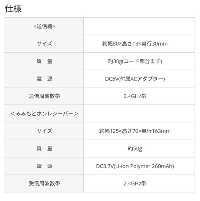 ■みみもとホンレシーバー:サイズ/約幅125×高さ70×奥行163mm、質量/約50g、電源/DC3.7V(Li-ion Polymer 260mAh)、受信周波数帯/2.4GHz帯