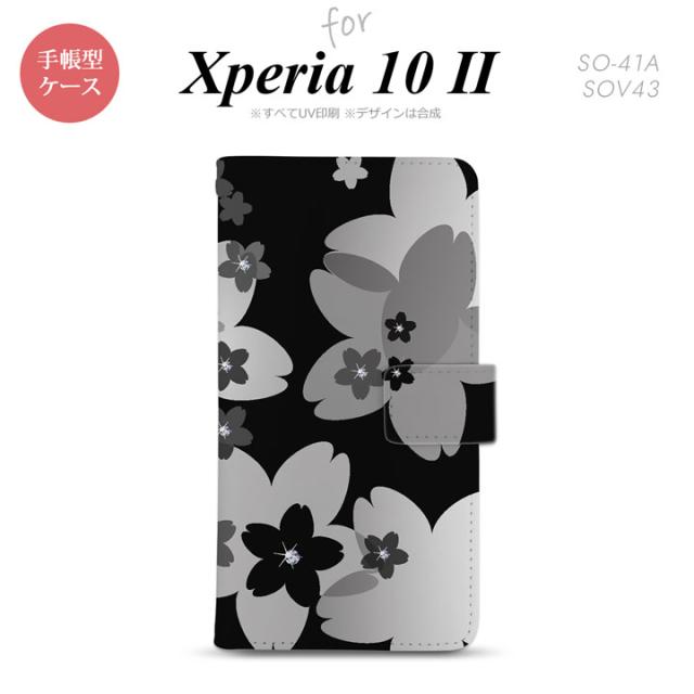 Xperia10 II 手帳型 スマホケース 全面印刷 おしゃれ ストラップホール有り 花柄 サクラ 黒