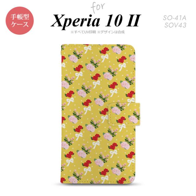 Xperia10 II 手帳型 スマホケース 全面印刷 おしゃれ ストラップホール有り 花柄 バラ リボン 黄