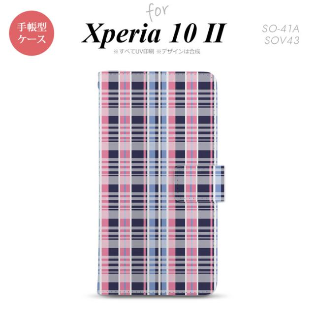 Xperia10 II 手帳型 スマホケース 全面印刷 おしゃれ ストラップホール有り チェック ピンク 青