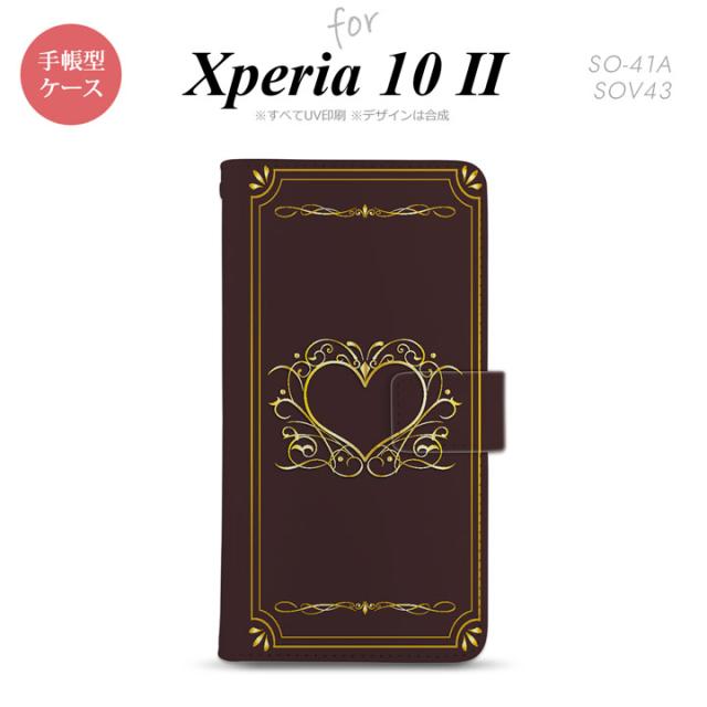 Xperia10 II 手帳型 スマホケース 全面印刷 おしゃれ ストラップホール有り ハート 飾り 茶 金