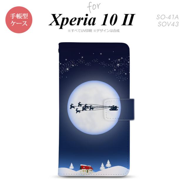 Xperia10 II 手帳型 スマホケース 全面印刷 おしゃれ ストラップホール有り 月とサンタ 青