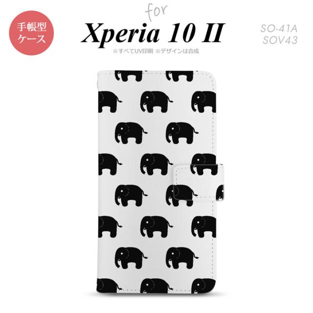 Xperia10 II 手帳型 スマホケース 全面印刷 おしゃれ ストラップホール有り ゾウ 白