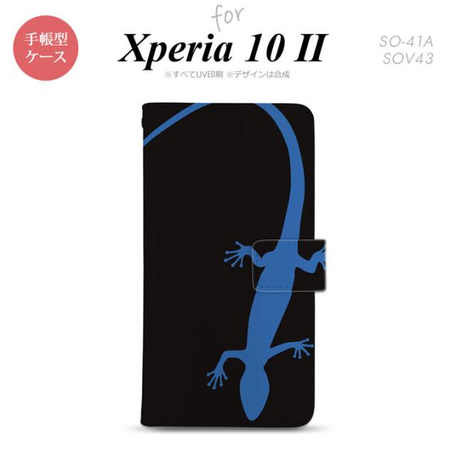 Xperia10 II 手帳型 スマホケース 全面印刷 おしゃれ ストラップホール有り トカゲ 黒 青