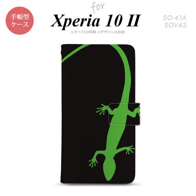 Xperia10 II 手帳型 スマホケース 全面印刷 おしゃれ ストラップホール有り トカゲ 黒 緑
