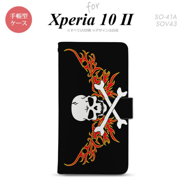 Xperia10 II 手帳型 スマホケース 全面印刷 おしゃれ ストラップホール有り ドクロ 白 横 赤黄
