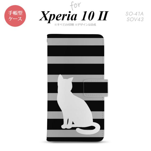 Xperia10 II 手帳型 スマホケース 全面印刷 おしゃれ ストラップホール有り 猫 ボーダー 黒