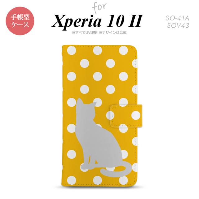 Xperia10 II 手帳型 スマホケース 全面印刷 おしゃれ ストラップホール有り 猫 水玉 イエロー