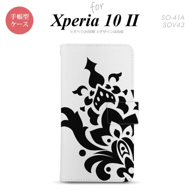 Xperia10 II 手帳型 スマホケース 全面印刷 おしゃれ ストラップホール有り ダマスク 黒