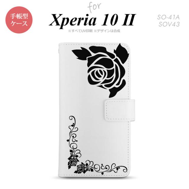 Xperia10 II 手帳型 スマホケース 全面印刷 おしゃれ ストラップホール有り バラ クリア 黒