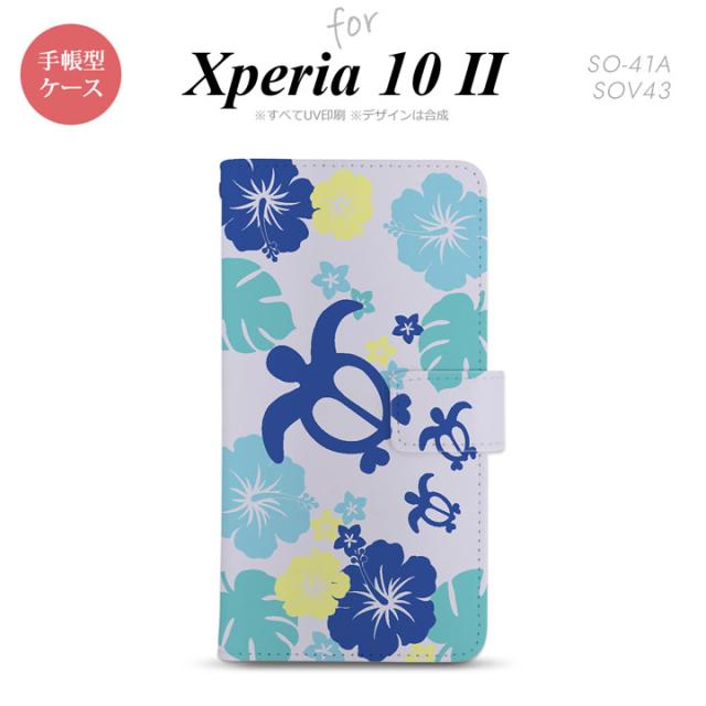 Xperia10 II 手帳型 スマホケース 全面印刷 おしゃれ ストラップホール有り ホヌ ハイビスカス 青