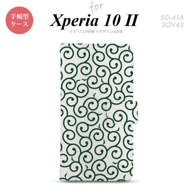 Xperia10 II 手帳型 スマホケース 全面印刷 おしゃれ ストラップホール有り 唐草 クリア 緑