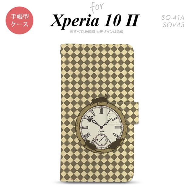 Xperia10 II 手帳型 スマホケース 全面印刷 おしゃれ ストラップホール有り 時計 チェック ベージュ