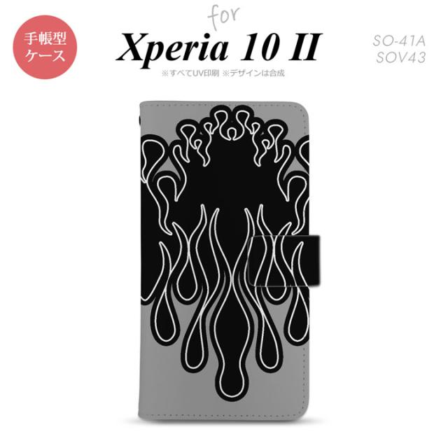 Xperia10 II 手帳型 スマホケース 全面印刷 おしゃれ ストラップホール有り ファイヤー 炎 黒 黒