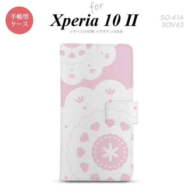 Xperia10 II 手帳型 スマホケース 全面印刷 おしゃれ ストラップホール有り レース クリア ピンク