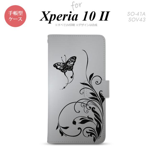 Xperia10 II 手帳型 スマホケース 全面印刷 おしゃれ ストラップホール有り 蝶と草 黒