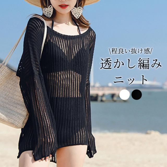 春新作 即納 Tシャツ トップス レディース 長袖 クロシェ編み ニット レース 透け ビーチファッション オーバーサイズ 水着の上から ママコーデ レイヤード ヘム風 薄手 体型カバー ゆったり 上品 無地 エレガント アメカジ セクシー ガーリー 海 春 夏 黒 白