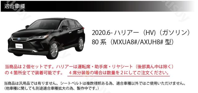 80系ハリアーは「運転席&助手席」と「後部座席(真ん中除く)」両方に装着可能です。全席に装着希望の場合は数量を2として注文をお願いいたします。