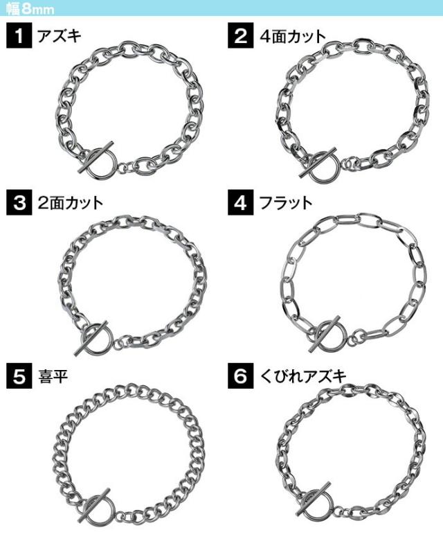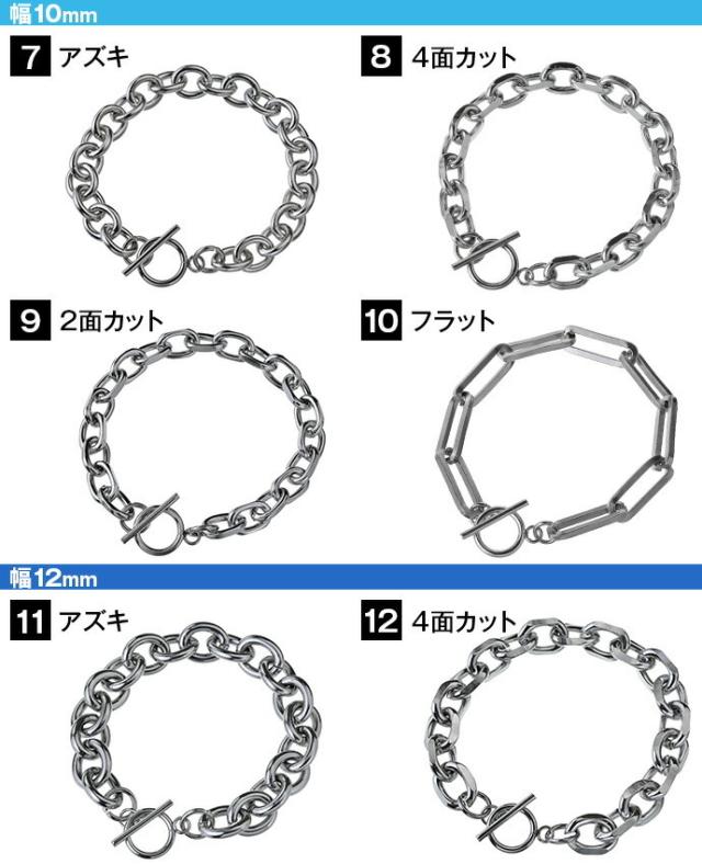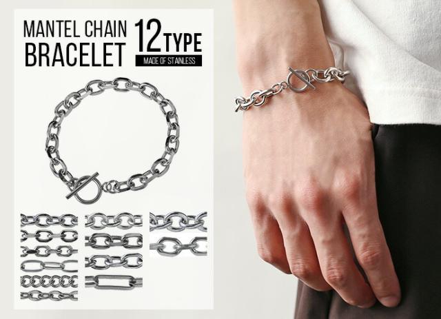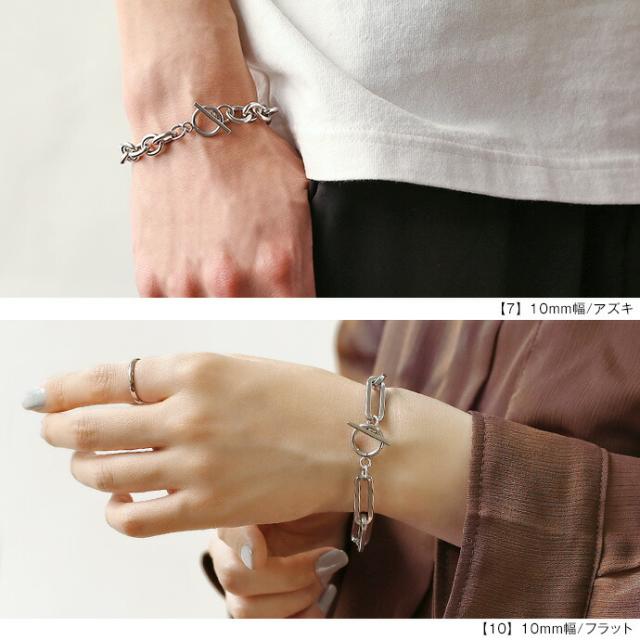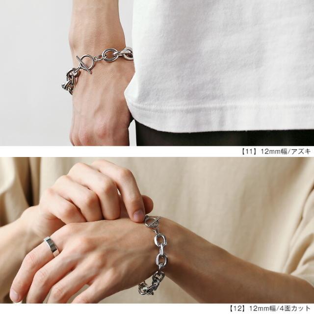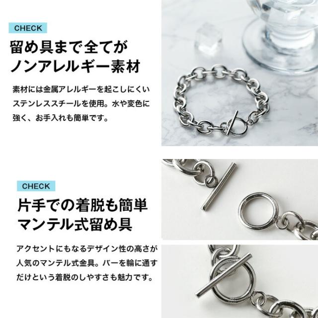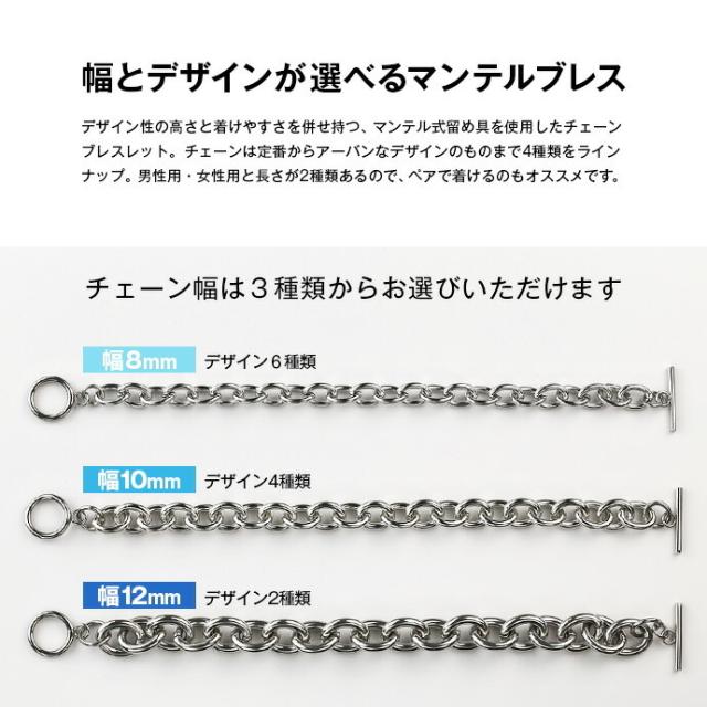 デザイン性の高さと着けやすさを併せ持つ、マンテル式留め具を使用したチェーンブレスレット。素材には金属アレルギーを起こしにくく、水や変色に強いステンレススチールを使用しています。8mm幅と10mm幅タイプには男性用・女性用と長さが2種類あるので、大切な方への贈り物やペアで着けるのもオススメです。