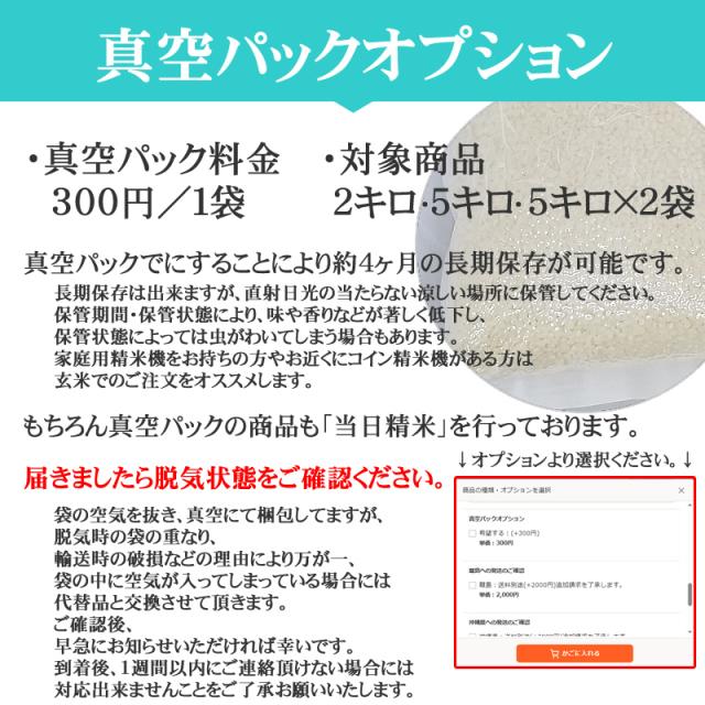 当店は玄米を販売させていただいており、ご希望のお客様には精米をサービスにて承っております。精米種類としては、1分づき、3分づき、5分づき、7分づき、白米、無洗米をご用意しておりますので、ご希望の精米方法をご選択ください。もちろん玄米のままでの発送もしております。 精米というのは玄米の表面のヌカ部分を剥離する作業でございます。そのため精米をご選択のお客様にお届けする重量は玄米重量からヌカ分が差し引かれた量目となりますことをご了承お願します。例として、10kgを白米精米をご選択した場合には1kgがヌカ部分として剥離され、約9kg分でのお届けとなります。ただし、使用している袋記載の量目は(玄米でご購入いただき、精米をサービスにて承っておりますため)玄米時の記載となりますことも合わせてご了承お願いします。